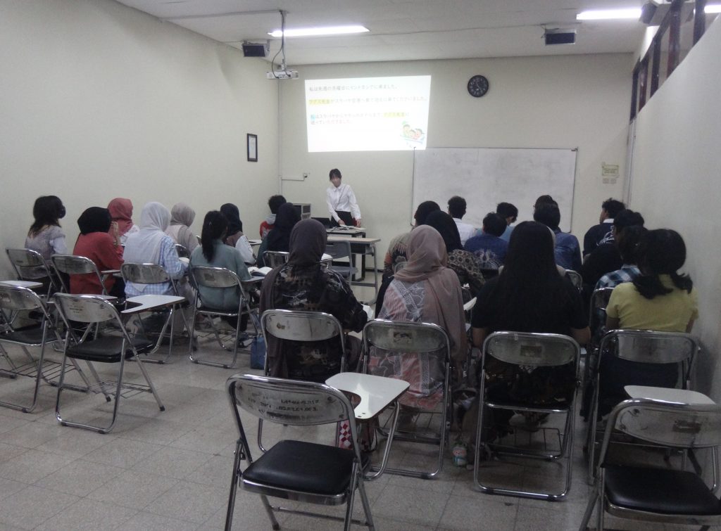 私は実習期間中2回の教壇実習を行いました。授業は『みんなの日本語初級Ⅱ』第41課と第42課の会話・練習Cを行い、その後に日本の文化紹介などを行いました。授業準備をする際には、イラストを使用したスライド作成ややさしい日本語で説明できることを心がけました。実際の教壇実習では、始まる前は緊張しましたが、学生が積極的に反応してくれたことで緊張が和らぎ、楽しく教壇実習を行うことができました。また、インドネシアの学生は積極的に発言してくれたり、わからないことがあっても遠慮せずに質問してくれるため、授業全体が明るく活気にあふれ学習意欲の高さを強く感じました。