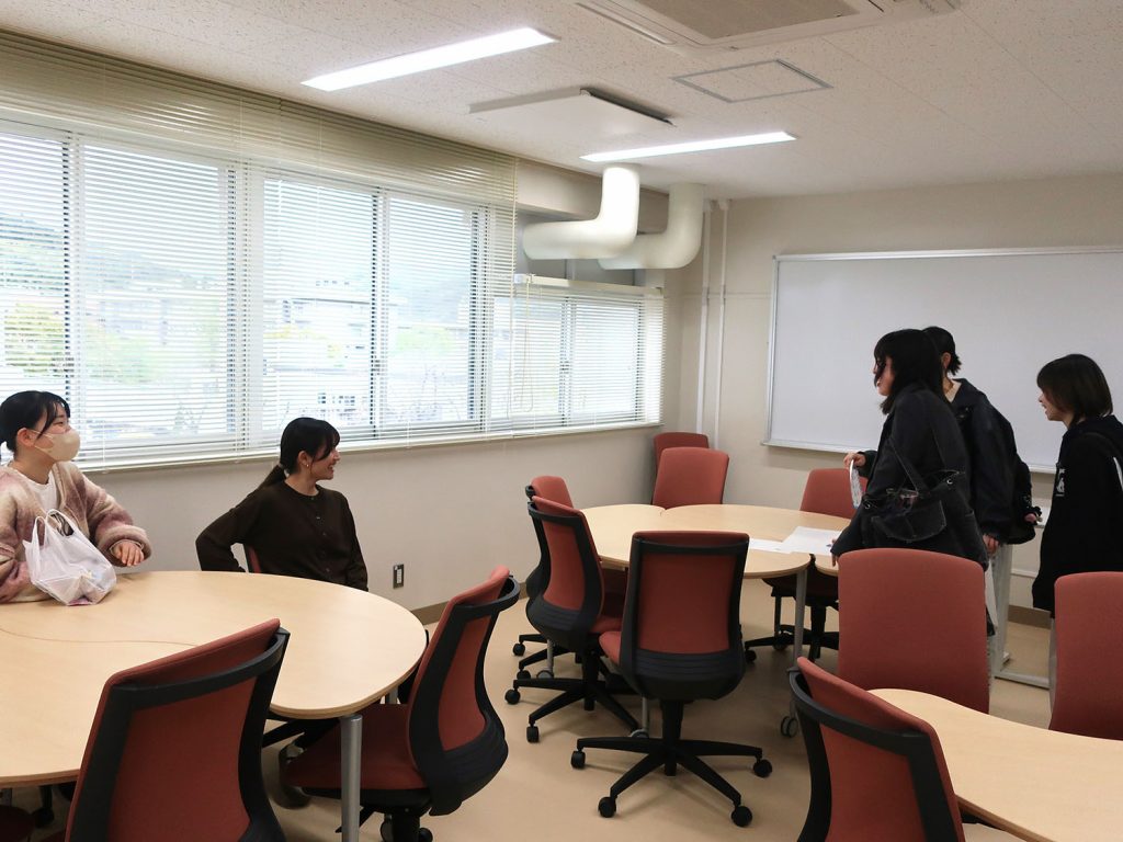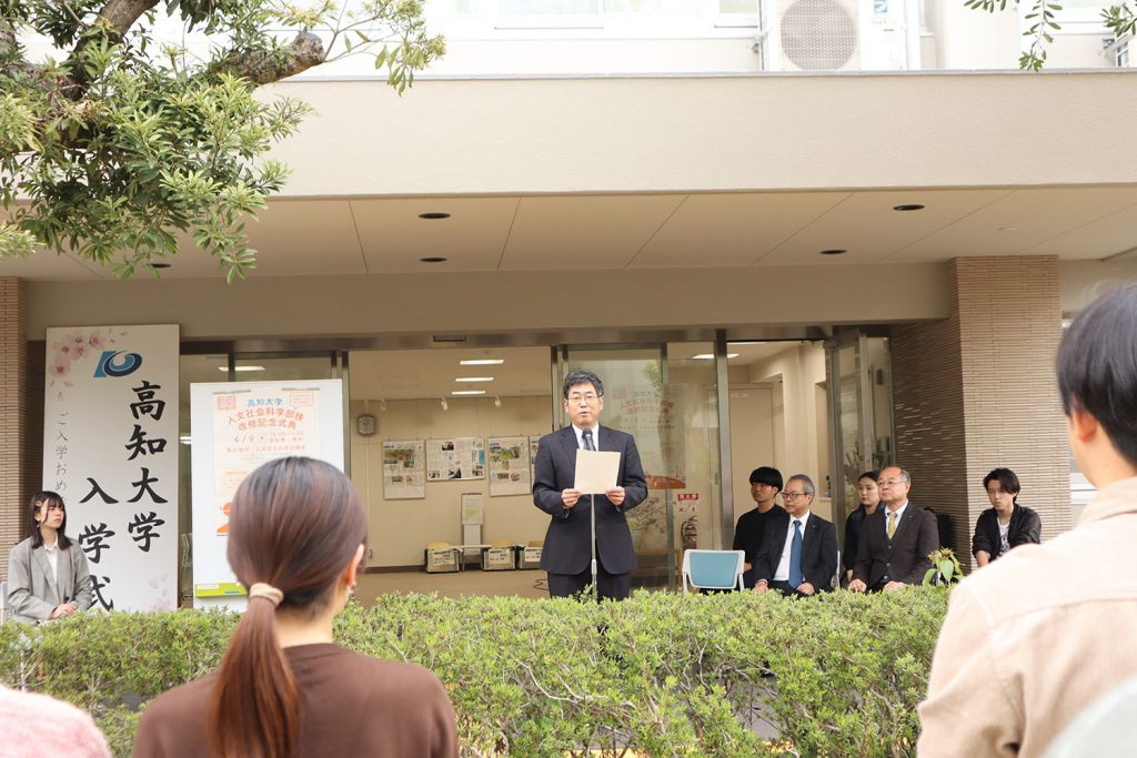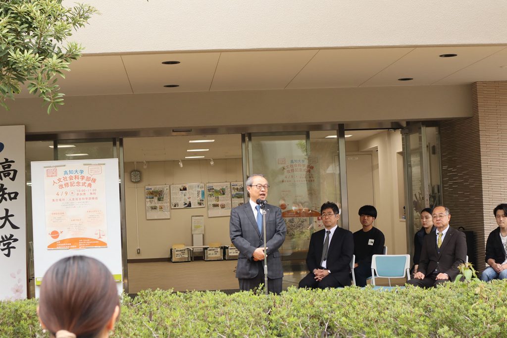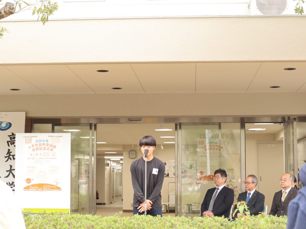 式典の冒頭では、緒方人文社会科学部長の挨拶と受田学長の祝辞、各コースの代表学生から改修された学部棟での学びに関する発言があり、人文社会科学部がこれまで歩んできた伝統と歴史、今後の人文社会科学部への期待などが語られました。