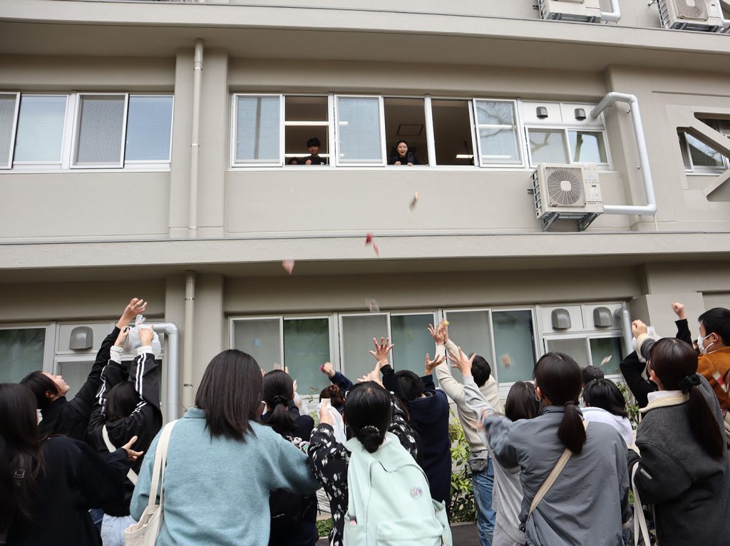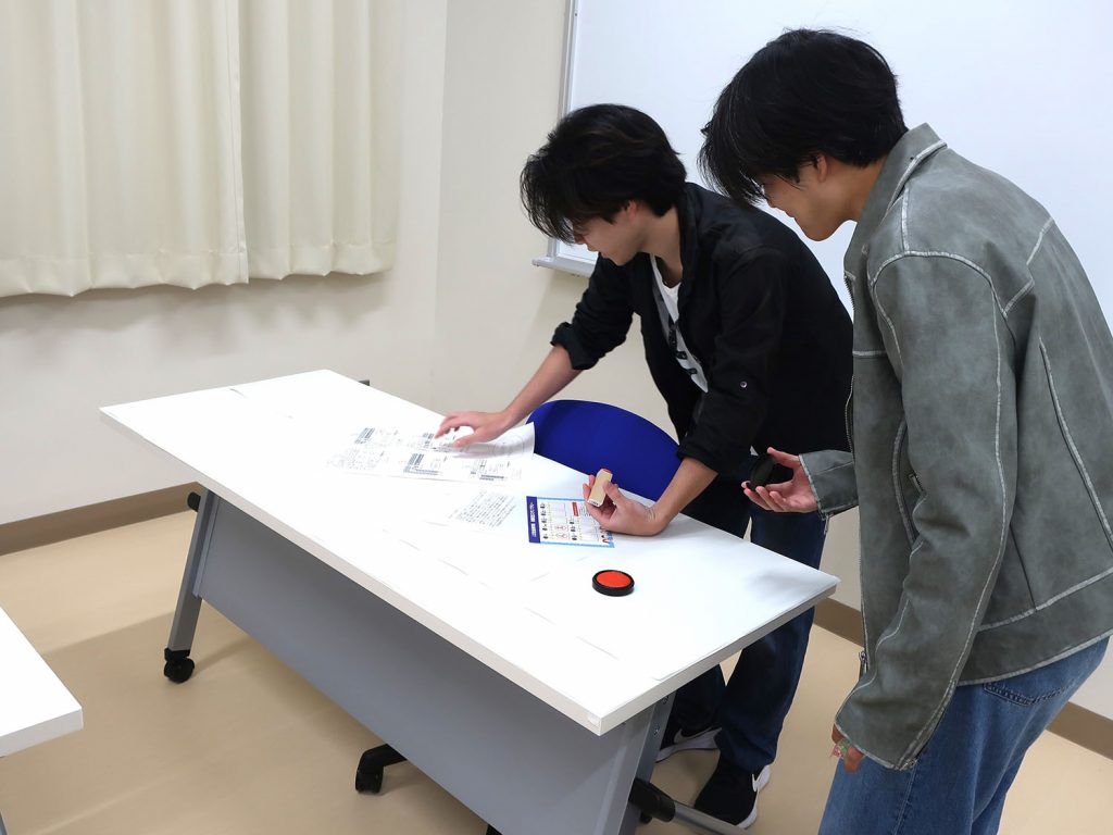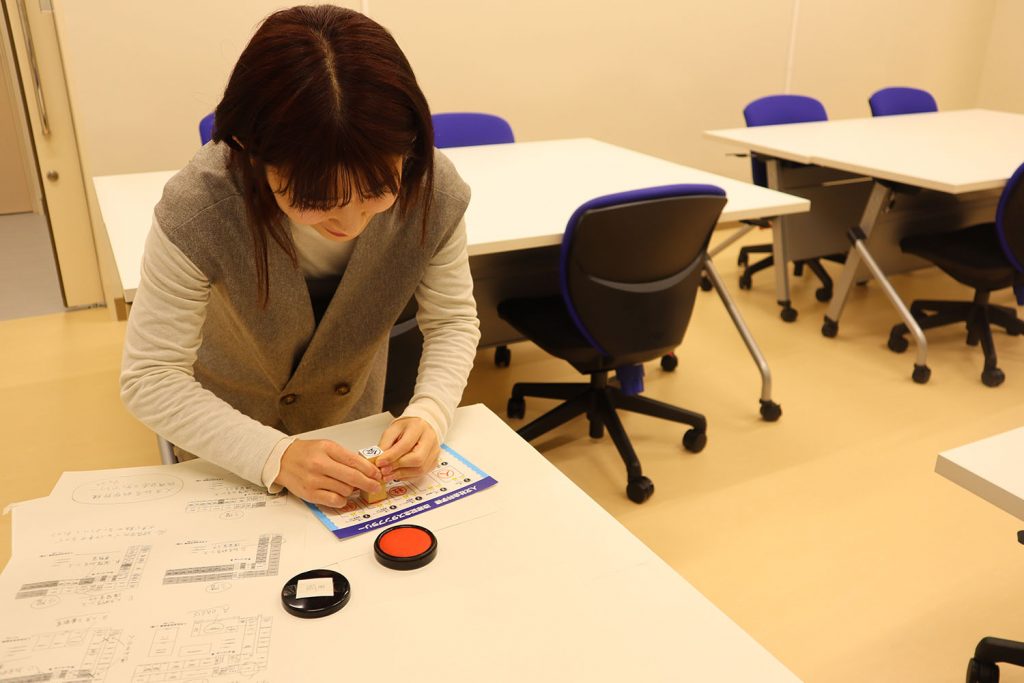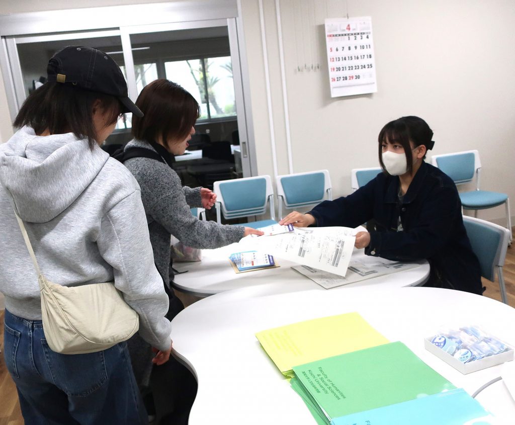 その後は、高知県で盛んな「餅投げ」にちなんだ「お菓子投げ」が行われ、ひとつでも多くのお菓子を取れるよう集まった参加者で会場は大いに賑わいました。中には当たりくじ付きのお菓子もあり、当選者には景品が手渡されました。また、新しくなった人文社会科学部棟内を巡るスタンプラリーも開催され、すべてのスタンプを集めた参加者には、記念のクリアファイルと高知大学のロゴ入りシールが贈られました。さらに、教員によるクイズ企画も行われ、正解した参加者には正解者限定シールが渡されました。